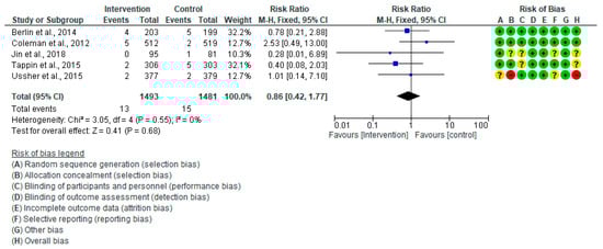 A meta-analysis of five RCTs [20,28,30,41,44] showed no significant consequence of the intervention on the study groups’ incidence of stillbirth (RR: 0.86, 95% CI = 0.42–1.77, p = 0.68). The analysis showed no heterogeneity (I2 = 0%) (Figure 11).