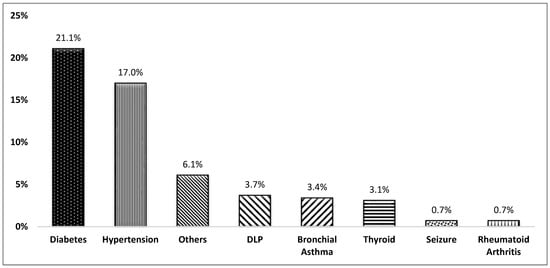 The most common comorbid conditions among the patients were diabetes (21.1%) and hypertension (17.0%), which are common chronic conditions (Figure 1). Other conditions like dyslipidemia (6.1%) and bronchial asthma (3.4%) were less common but still notable. Seizure disorders and rheumatoid arthritis are rare, each affecting less than 1% of the patients.
