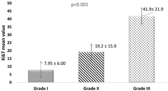 Specifically, patients with a Ki67 index of ≥20 were significantly more prevalent among those with Grade III tumors and IDC types. Conversely, a Ki67 index of <20 was more commonly observed in patients with Stage IV cancer. As illustrated in Figure 2, the mean Ki67 value for Grade III tumors was significantly (p < 0.001) higher than that for Grade I or Grade II tumors.