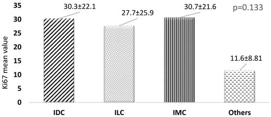 Relationship between different cancer types and Ki67. p-value has been calculated using one-way ANOVA. IDC, Invasive Ductal Carcinoma; ILC, Invasive Lobular Carcinoma; IMC, Invasive Micropapillary Carcinoma.