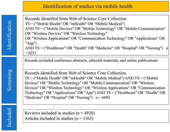 The literature is extracted from the Science Citation Index Expanded and Social Science Citation Index of the Web of Science Core Collection. The search period spans from January 2005 to December 2024. The keywords for mHealth care are TS = (“Mobile Health” OR “mHealth” OR “Mobile Medical”) AND TS = (“Mobile Devices” OR “Mobile Technology” OR “Mobile Communication” OR “Wireless Devices” OR “Wireless Technology” OR “Wireless Applications” OR “Communication Technology” OR “Applications” OR “App”) AND TS = (“Healthcare” OR “Health” OR “Medicine” OR “Hospital” OR “Nursing”). Selected articles from January 2005 to December 2024, excluding conference abstracts, editorial materials, and online publications, a total of 6093 records of articles and review articles were kept. CiteSpace 6.4.R1 and VOSviewer 1.6.20 were used to comb and visualize the data of the included 6093 valid citations in our prior study.