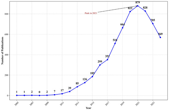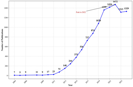 According to the retrieval results from PubMed and Google Scholar (Figure 3 and Figure 4), publication trends differ due to the varying search mechanisms employed by WOS, PubMed, and Google Scholar (File S1). Notable differences in publication trends are evident: both databases show significant growth from 2012 to 2020, with peaks occurring in 2022, though the subsequent decline patterns vary considerably. This variation likely stems from PubMed’s focus on biomedical literature and clinical studies, while Google Scholar encompasses a broader range of resources, including gray literature and preprints. These findings suggest that while core digital research may be decreasing, peripheral research continues to expand. This pattern indicates a potential shift in research focus from basic concept validation to advanced applications, suggesting the field has matured and entered an integration phase.