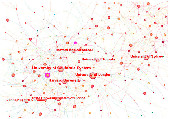 A total of 525 institutions have made contributions to research on mHealth. To better understand the distribution of the author’s countries and institutions, we constructed a map of these articles via Citespace. The visualization analysis diagram shows 525 nodes and 828 connections, with a network density of 0.0064 (Figure 6). It is a visual analysis of the aforementioned results through CiteSpace, where each node represents an institution, and the size of the node is proportional to the number of articles published. The University of California, the University of London, Harvard University, and Duke University are actively collaborating. Within these entities, the University of California leads in publication volume with 248 articles, followed by the University of London and Harvard University, both of which have published over 200 articles (Table 1). Moreover, IDIBAPS in Spain has the highest centrality of 0.09 in the field of mHealth research. This indicates that it holds a significant level of importance or influence within the network. As a result, the research on mHealth is primarily concentrated in European and American research institutions.