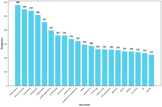 In the keyword section, terms with broad usage such as “mHealth”, “technology”, “health”, and “care” have been excluded. Figure 7 presents the top 20 most frequent keywords (File S1). Among these keywords, “mobile phone” (580 counts) and “mobile app” (336 counts) appear multiple times, indicating that mHealth still primarily relies on smartphones as the main medium [17]. The frequent occurrence of “physical activity” (548 counts) highlights its role as a primary health intervention. The terms “adults” (311 counts) and “children” (246 counts) suggest that the main target populations for mHealth initiatives are likely adults and children. The presence of “metaanalysis” (286 counts) and “randomized controlled trial” (321 counts) signifies the research methodologies employed in the field of mHealth. Keywords like “interventions”(361 counts), “management” (508 counts) and “self-management” (259 counts) primarily point to the focus of mHealth research on health interventions and management [17]. The inclusion of “mental health” (362 counts) emphasizes the importance of mental health in the domain of mHealth [18].