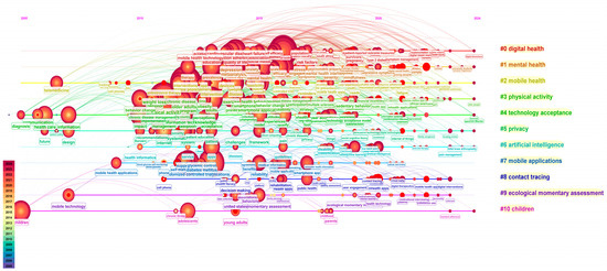 Keyword Clustering Analysis of mHealth Research Using CiteSpace. Note: This visualization presents a thematic clustering of digital health research areas, organized into 11 distinct clusters identified by numbers (#0–#10). Each cluster represents a key research domain: children’s health (pink, top left), privacy concerns (light green, top), artificial intelligence applications (light blue, top right), technology acceptance (green, top), mobile health and telemedicine (yellow, center right), digital health interventions (red, center right), mobile applications (light blue, center left), physical activity (light green, bottom center), mental health (orange, center), contact tracing (deep blue, bottom left), and ecological momentary assessment methods (purple, bottom).