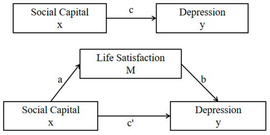Data were analyzed using SPSS 25.0, with measures expressed as mean ± standard deviation ( ± S) and counts expressed as frequency and percentage. Pearson correlation was used to analyze the associations among social capital, life satisfaction, and depression. The mediating role of life satisfaction was assessed using PROCESS 3.4 analysis. The test procedure provided by Zhonglin et al. [33] was used to establish three regression variances for the independent variable (x), the mediating variable (M), and the dependent variable (y) in accordance with Figure 1, and the regression coefficients were tested sequentially in three steps. First, coefficient c was tested; if not significant, the mediation effect analysis was stopped. If coefficient c was significant, coefficient a and coefficient b were sequentially tested; if either a or b was not significant, a Sobel test should be performed. If both were also significant, we continued to test coefficient c′; the partial mediation effect of M is significant if c′ is also significant, and the full mediation effect of M is significant if c′ is not. In Figure 1, c is the total effect of x on y, and a × b is the mediating effect of M. The proportion of the mediating effect to the total effect was found using the formula a × b/c. This study performed 5000 bootstrap replicates and used them to determine 95% confidence intervals for indirect effects. The test level was α = 0.05.
