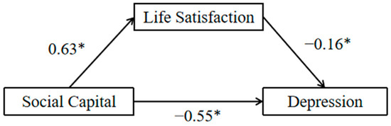 Path diagram of the mediating role of life satisfaction between social capital and depression. (Note: * p < 0.05).