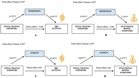 Figure 2. Mediation model. Direct and indirect effects of lifetime trauma on IBD activity (A,C) and functional bowel symptoms (B,D) through depression (A,B) or anxiety (C,D). All path estimates are unstandardized regression coefficients. * p < 0.05; *** p < 0.001.