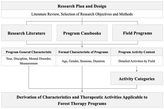 In this study, research literature, program casebooks, and field programs were collected to analyze programs developed for improving mental disorders. Subsequently, general and formal characteristics were analyzed, and program activities were derived. The derived program activities were then categorized through discussions among six researchers (Figure 1).