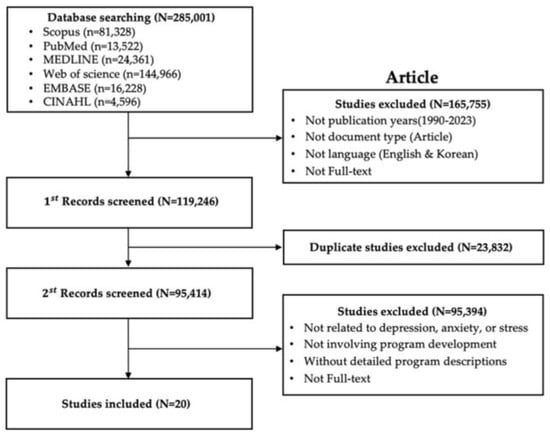 Seven exclusion criteria were used to select data for mental illness recovery programs, and papers that did not include detailed plans to identify activities were excluded because detailed activities of the program had to be extracted. In this study, the data were extracted by checking the full text of the data using the following criteria: (1) Full-text files were unavailable; (2) the program was not related to depression, anxiety, or stress; (3) the program was unrelated to program development; (4) the program analyzed the effectiveness of an already developed program; (5) the program was composed solely of educational activities, not therapeutic activities; (6) detailed program plans were unavailable; (7) the program required specialized qualifications for implementation.