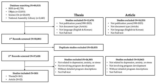 Figure 3 shows the selection process for 383 Korean articles. The initial search yielded 42,739 articles from RISS, 23,015 from DBpia, 20,619 from Science On, and 2640 from the Library of Congress. The initial search literature was screened for publication year, language of publication, publication type, and availability of full-text files, resulting in 165,755 exclusions. After excluding 20,453 duplicates, 383 articles were finally selected based on the final selection criteria.