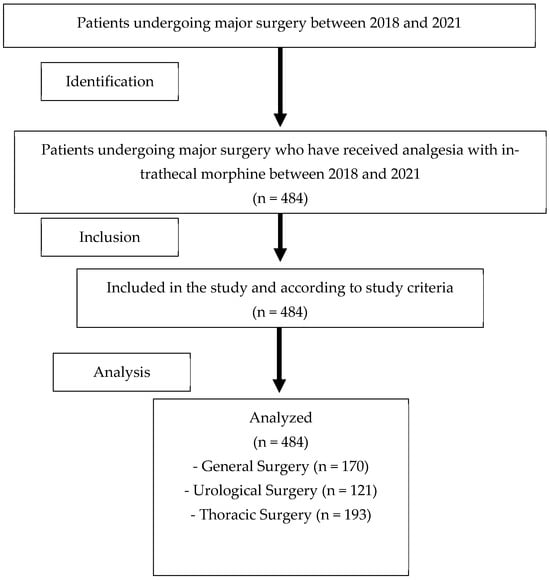 A total of 484 patients who underwent major surgery at Donostia University Hospital between January 2018 and December 2021 received intrathecal morphine as an analgesic technique (Figure 1. Flow chart).