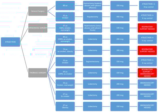 We want to emphasize that the observation of a higher rate of atelectasis (without this difference being statistically significant) among patients undergoing thoracic surgery may be explained both by the surgery itself and by the fact that, in our center, a chest X-ray is routinely performed on all patients undergoing major lung resection, which is not performed in other specialties. Therefore, in most cases, it may be an incidental finding, as few cases required bronchoscopy or respiratory support.