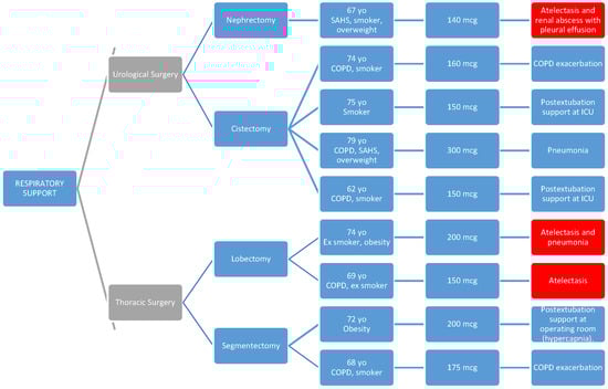 As seen in the diagrams, all parients presented one or more of the predisposing preoperative factors such as respiratory pathology (COPD and SAHS), obesity, or smoking habits [40,41].