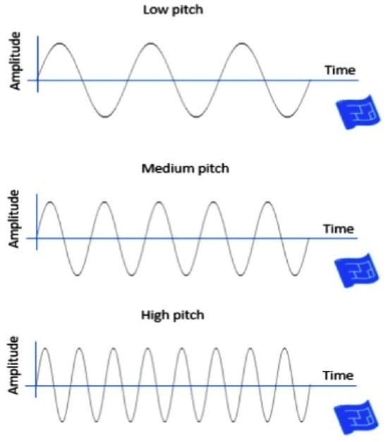Three sampled pitch speech materials used in this study as acoustic input for classification. Sound waves representing low, medium, and high pitch. As pitch increases, the frequency of the waveform increases while amplitude remains constant, illustrating how pitch affects wave frequency.