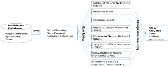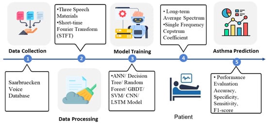 The machine learning algorithms utilized in this study represent a diverse set of models, each with unique strengths in handling structured and unstructured data [21,22]. Artificial neural networks (ANNs) are inspired by biological neurons and consist of multiple interconnected layers that learn complex patterns through backpropagation. Decision Trees are hierarchical models that split data based on feature conditions, offering high interpretability but being prone to overfitting. Random Forest, an ensemble learning method, improves upon Decision Trees by training multiple trees on random subsets of data and aggregating their predictions to enhance accuracy and reduce variance. Gradient Boosting Decision Trees (GBDTs), another ensemble technique, builds trees sequentially, where each new tree corrects the errors of the previous ones, leading to strong predictive performance. Support Vector Machines (SVMs) classify data by finding the optimal hyperplane that maximizes the margin between different classes, making them effective for high-dimensional datasets. Convolutional Neural Networks (CNNs) excel in processing spatial data, particularly images, by leveraging convolutional layers to extract hierarchical features. In this study, we used AlexNet as the CNN model to analyze asthma-related voice recordings from the Saarbruecken Voice Database. Sustained vowel sounds were converted into MFCC feature maps and resized to fit AlexNet’s input. Lastly, Long Short-Term Memory (LSTM) networks, a type of recurrent neural network (RNN), were designed to capture long-term dependencies in sequential data, making them well-suited for time-series analysis. By leveraging these diverse algorithms, this study aims to identify the most effective approach for predicting asthma based on the given dataset. The system operation is illustrated in Figure 4.