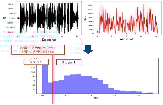 The denoising process removes signals with a low Signal-to-Noise Ratio (SNR), as shown in Figure 3 [16]. This figure illustrates how signals are distinguished from noise based on the SNR. The top-left plot shows frequency variations over time, depicting a fluctuating waveform that likely contains both signal and noise. The top-right plot represents signal intensity using Root Mean Square (RMS), showing significant variations. The middle annotation states “SNR > 15→Reserve” and “SNR < 15→Delete”, indicating that data with an SNR below 15 are classified as noise and filtered out. The bottom histogram displays the RMS distribution, with a red vertical line marking the SNR = 15 threshold. The left side of the histogram represents low RMS values corresponding to low SNR, categorized as noise, while the right side represents higher RMS values corresponding to high SNR, retained as useful signals. The primary objective of this process is to filter out noise using the SNR threshold and retain high-quality signal data.