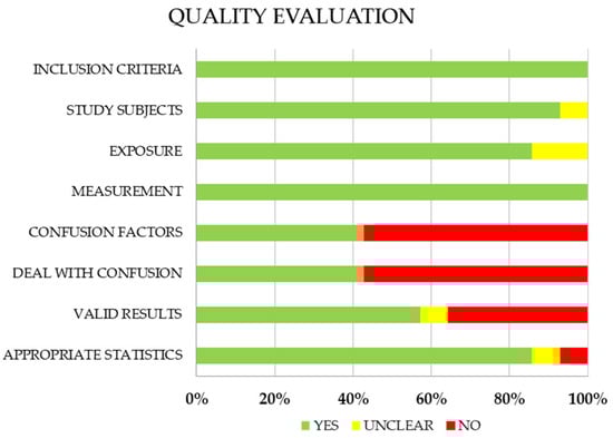 We found that 100% of the studies present clearly defined inclusion criteria, gave a detailed description of the study participants and the environment and clearly outlined objective criteria for measuring the condition. In the case of the evaluation of exposure measured in a valid and reliable way, a study appeared that provided little clarity. 67% of the confounding factors were not identified, and strategies to deal with the confounding factors were not established. 42% of the results were not measured in a valid and reliable way. Finally, the statistical analyses were mostly adequate (83%). The general assessment of the studies allowed for the inclusion of all of them (Figure 1).