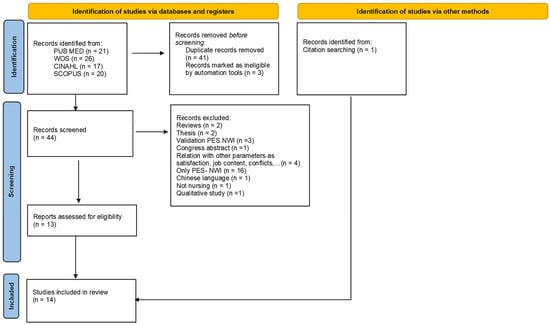 Most studies were conducted in Europe (n = 8; 57.1%) and were published between 2006 and 2023 with an increasing trend over time. Six of the studies were from Spain, two from China, two from Poland, one from Belgium, one from New Zealand, one from the Philippines, and one from Canada. All studies focused on burnout (n = 14; 100%), and only two evaluated engagement (n = 2; 14.2%). The 14 studies that examined the PES-NWI included a total of 31,919 adult nursing participants, mostly women whose age ranged from 22 to 59 years.