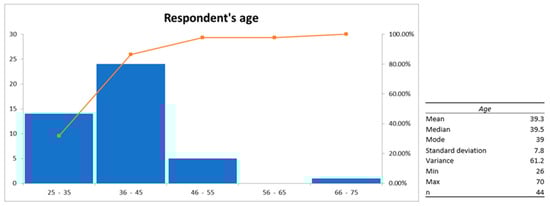 The majority of participants were female (97.7%), specifically 42 mothers, 1 grandmother, and 1 father. The mean (SD) age of the participants was 39.3 (±7.8) years (Figure 1). All participants were of Portuguese nationality, although five had dual nationality (n = 3 Brazilian, n = 1 Moldovan, and n = 1 Ukrainian).