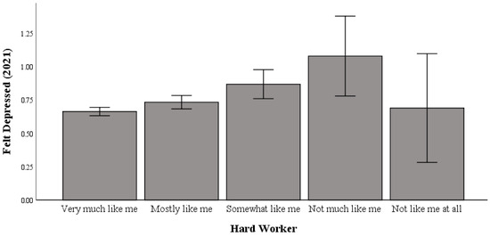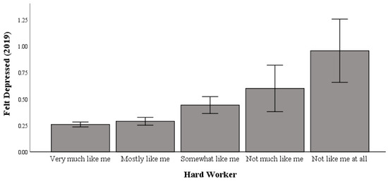 Univariate testing indicated a significant difference between working hard and feeling depressed in 2019 (range: 0 to 3 (higher scores indicate more incidents of feeling depressed); F (4, 5031) = 11.748; p < 0.001; η2p = 0.009; pwr = 1.00). Post hoc comparisons using Bonferroni correction indicated significant differences in hard work, whereby those who responded with “not like me at all to work hard” (M = 0.96) had significantly higher levels of feeling depressed than those with “very much like me to work hard” (M = 0.26), “mostly like me to work hard” (M = 0.29), and “somewhat like me to work hard” (M = 0.44) responses (Table 1).