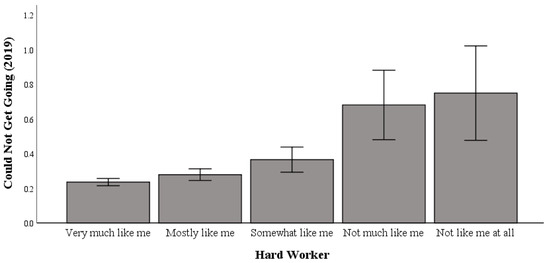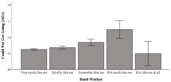 Univariate testing indicated a significant difference in the relationship between working hard and “getting going” in 2019 (range: 0 to 3 (higher scores indicate more incidents of being unable to “get going”); F (4, 5032) = 10.931; p < 0.001; η2p = 0.009; pwr = 1.00). Post hoc comparisons using Bonferroni correction indicated significant differences in working hard, whereby the “not like me at all to work hard” (M = 0.75) group had significantly higher levels of difficulty “getting going” than the “very much like me to work hard” (M = 0.24) and “mostly like me to work hard” (M = 0.28) groups (Table 2).