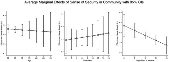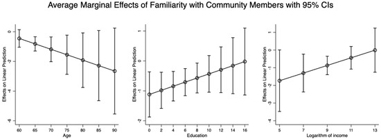 Figure 2, Figure 3 and Figure 4 provide the average marginal effects—familiarity with and trust in other members living in the same community, and the sense of security in the community where older adults live—on mental health among older people with different ages, education levels, and incomes. Figure 2 presents the average marginal effect of familiarity with other members living in the same community on the mental health of the elderly, increasing with increments in age and decreasing with increments in education attainment and income. The results showed that age, education, and income are important moderator mechanisms in the effect of familiarity with other members living in the same community on the mental health of the elderly. The older the elderly are, the lower their education, and the lower their income level; older people’s mental health status depends more on familiarity with residents living in the same community.