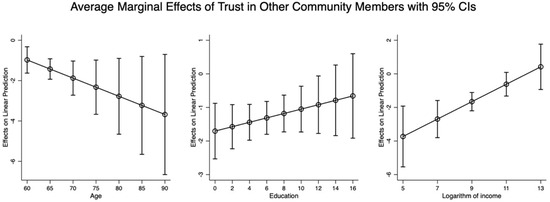 The average marginal effect of trust in other community members on mental health of elderly with different ages, education, and logarithm of income.