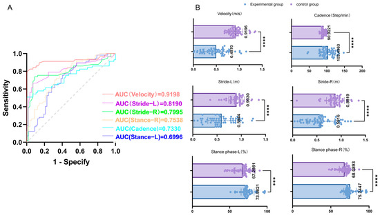 (A) Area under the curve (AUC) for different gait parameters: The AUCs for various gait parameters (velocity, cadence, left and right strides, and left and right stance phases) are presented. A larger AUC indicates higher reliability and validity. As shown in the figure, velocity has the largest AUC, indicating it possesses the highest reliability and validity among the assessed parameters. (B) Scatter plots of gait parameter comparison between experimental and control groups: The average values of the gait parameters for the experimental and control groups are summarized above. The symbols indicate the statistical significance of differences between the groups: *** represents p < 0.001, and **** represents p < 0.0001.