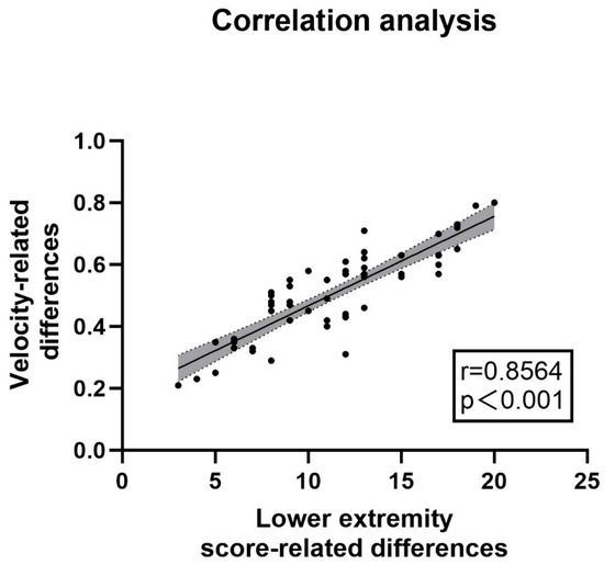 The clinical correlation was verified by comparing the gait parameters and UPDRS-III scores between the “off” state and the “on” state in the PD experimental group (n = 57). (1) Scale Results: Among the patients included in the experimental group, there were 33 males and 24 females. The average age of the patients was 62 years old, and the average disease duration was 6 years. The average UPDRS-III score in the “off” state was 46.18, while in the “on” state it was 22.23, with an average improvement rate of more than 51.77%. (2) Spatiotemporal Gait Parameters Measured by the Lower Limb Exoskeleton: The average velocity of the patients increased from 0.41 m/s to 0.94 m/s. The left stride length increased from 0.59 m to 0.68 m, and the right stride length increased from 0.59 m to 0.69 m. The proportion of the left stance phase decreased from 72.34% to 70.46%, and that of the right stance phase decreased from 73.70% to 68.25%. Increases in walking speed and stride length, as well as a decrease in the proportion of the stance phase, all indicated an improvement in the patients’ gait ability, and all of these changes were statistically significant (p < 0.05). The relevant parameters are shown in Table 3. A correlation analysis was conducted between the difference in UPDRS-III scale scores before and after the impact test and the difference in velocity. The results showed a strong correlation (r = 0.8564, p < 0.001, see Figure 4). The above results suggested that the lower limb exoskeleton robot can be effectively used to monitor the gait changes of patients and has the potential to serve as a substitute for UPDRS-III as a potential biomarker.