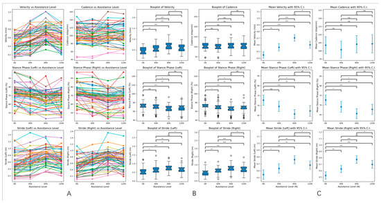 (A). Line graphs of velocity, cadence, stride, and stance phase ratio under different assistance levels. The line graphs display the changes in velocity, cadence, stride, and stance phase ratio for the 57 patients in the experimental group at various assistance levels. This visualization illustrates the trends and patterns in gait parameters as external assistance is varied. (B). Box plots of gait parameters under different assistance levels. The box plots provide a summary of the gait parameters for the experimental group at different assistance levels. Each plot displays the median, quartiles, and potential outliers, offering a clear view of the distribution and variability of the data for velocity, stride, and stance phase percentages. (C). The 95% confidence intervals for gait parameters under different assistance levels. The figure shows the 95% confidence intervals for the gait parameters of the experimental group across different assistance levels. These intervals indicate the range within which we can be 95% confident that the true mean of each parameter lies, highlighting the reliability of the observed differences. In the context of statistical significance: none of * indicates p > 0.05 (ns: not significant), * indicates p < 0.05 (significant), ** indicates p < 0.01 (highly significant), *** indicates p < 0.001 (very highly significant).