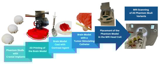 Visualization of the complete MRI scanning setup, including 3D-printed skulls with implants, brain model casting, tumor simulation, and placement within the MRI head coil.