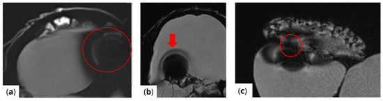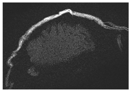The simulated tumor (a catheter filled with contrast agent) was adjusted in depth to monitor the formation of artifacts and assess its visibility. The skulls were imaged in sections, with each section scanned using implants made from titanium and PEEK materials. The imaging sequences were selected by a radiologist based on prior experience with tumor and cranial implant visualization. Image reconstruction after sequence acquisition was not feasible; therefore, parameters to minimize artifact formation had to be adjusted before starting each sequence. For each skull, two to three sequences were chosen. The total imaging time for a single skull was limited to a maximum of 20 min. For each sequence (Table 1), the field of view (FoV) was adjusted, phase encoding was set, and image contrast was optimized by suppressing either fat or water to enhance visualization. The slice thickness and resolution matrix remained unchanged, as modifications would not contribute to improved imaging quality.