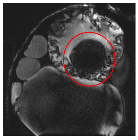 A gadolinium-based contrast agent (1.0 mmol/mL) was used to simulate tumor presence (Figure 2) and enhance lesion visualization within the phantom models. The contrast agent was enclosed in a balloon catheter system to maintain stability throughout the imaging process and prevent diffusion-related signal variations. This setup ensured consistent artifact evaluation while allowing for differentiation between implant-induced artifacts and actual anatomical structures. Given the paramagnetic properties of gadolinium, the contrast agent improved the signal intensity by shortening the T1 and T2 relaxation times, thereby enhancing the visibility of simulated lesions in MRI scans. Additionally, the balloon catheter method used to introduce the contrast agent ensured a controlled and repeatable simulation of contrast uptake, allowing for direct comparisons between different implant materials and MRI sequences.