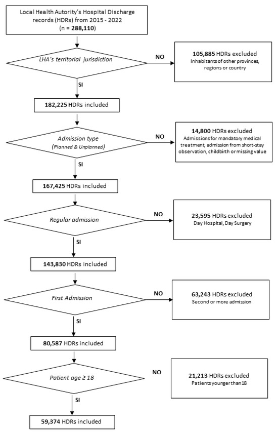 This was a retrospective observational study performed in the Local Health Authority (LHA) of Pescara, a Province of the Abruzzo region with a population of approximately 320,000 inhabitants in the period 2015–2022. The LHA has three hospitals: a tertiary referral hospital (hub) and two secondary hospitals (spokes). Data were collected from the LHA registry of hospital discharge records (HDRs). The HDRs include a large variety of data regarding patients’ demographic characteristics and hospitalization such as gender, age, and other information such as admission and discharge date and the discharge type, which also includes death. The HDRs also include information about the diagnoses that led to hospitalization or that are concurrent including complications (a maximum of six diagnoses, one principal diagnosis, and up to five comorbidities) and a maximum of six procedures or interventions that the patient underwent during hospitalization. Diagnoses and procedures were coded according to the International Classification of Disease, 9th Revision, Clinical Modification (ICD-9-CM), the National Center for Health Statistics (NCHS), and the Centers for Medicare and Medicaid Services External, Atlanta, GA, USA.