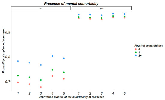 The probability of unplanned admissionis directly affected by the number of comorbidities and DI among patients without mental comorbidities. In the other hand, the presence of a mental condition enhance the probability of unplanned admissions, without differences across DI quintiles and number of comorbidities, as reported in Figure 2.