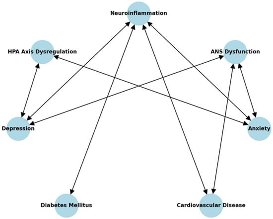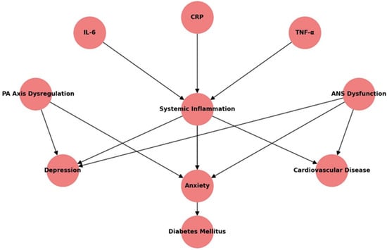 Reduced HRV, a robust marker of autonomic dysfunction, has been identified as a predictor of both depressive severity and cardiovascular mortality []. Mechanistically, ANS dysregulation exacerbates systemic inflammation by increasing sympathetic-driven cytokine production and impairing vagally mediated anti-inflammatory reflexes []. This autonomic imbalance not only amplifies inflammation but also contributes to emotional dysregulation, creating a self-reinforcing cycle that worsens both conditions.