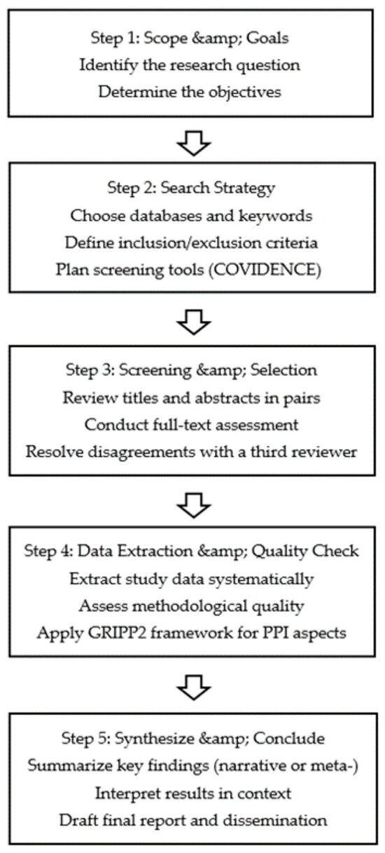 This protocol follows a systematic review design focusing on methodologies for patient and public involvement (PPI). We will first establish the specific objectives and the research question. Next, we will develop the search strategy for the selected databases (PubMed, EMBASE, CINAHL), choose studies based on our inclusion and exclusion criteria, conduct data extraction and quality assessment, and finally synthesize the findings. This protocol follows the Preferred Reporting Items for Systematic Reviews and Meta-Analyses for Protocols (PRISMA-P) guidelines, as illustrated in Figure 1. This figure depicts each stage of the review: (1) defining the research question and objectives, (2) developing the search strategy, (3) screening and selecting studies, (4) data extraction and quality assessment, and (5) synthesizing and concluding. Figure 1 thus provides a clear roadmap for our systematic review process. The complete PRISMA-P checklist is provided as a Supplementary File for transparency [20]. The registration number in PROSPERO is CRD42024444374.