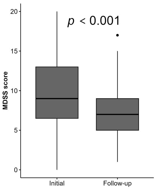 Changes in the MDSS score in a follow-up period in kidney transplant recipients. Abbreviations: MDSS—Mediterranean Diet Serving Score.