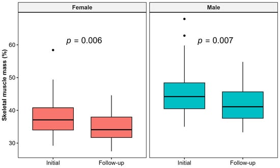 Skeletal muscle mass significantly deteriorated among the cohort (from 33 kg (IQR 12.12)/41.8% (IQR 6.46) to 29 kg (IQR 12.83)/39% (IQR 6.14); p-values 0.007 and 0.004, respectively), as presented in Supplementary Table S1. Figure 4 represents the changes in skeletal muscle mass % in male and female KTRs.