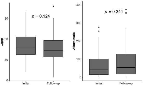 Significant changes in the serum creatinine level, eGFR, and albuminuria during follow-up were not found, as shown in Supplementary Table S1 and Figure 5. Nonetheless, 32 (33%) participants had a higher eGFR, and 56 (58%) had a lower eGFR in the follow-up period.