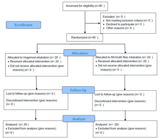 This is a randomized controlled trial, and Ethics Committee approval from the Institutional Review Board of our university hospital (09.2021.961) was obtained. The study was retrospectively registered on www.clinicaltrials.gov (Registration No: NCT06484517). A total of 40 elective surgical patients under the age of 3, classified as American Society of Anesthesiologists (ASA) 1–3 risk group, who underwent general anesthesia with predicted normal airways were included in the study. Patients were divided into two groups using a sealed envelope method as McGrath Group and HugeMed Group. The flow diagram is presented in Figure 1. After standard anesthesia monitoring to each group, general anesthesia was administered. Written informed consent was obtained from the parents of the patients.