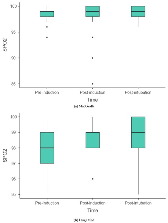 Box plot graphs of the SpO2 change over time in the groups. Dots represent the outliers. (a) MacGrath. (b) HugeMed.