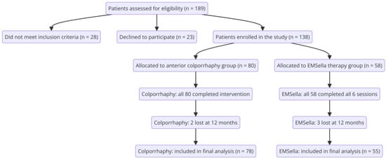 This prospective comparative study was conducted between January 2021 and December 2024 to evaluate the outcomes of two distinct treatment modalities for urinary incontinence associated with grade 2 cystocele: EMSella therapy and surgical anterior colporrhaphy. Pelvic organ prolapse was classified using the standardized Pelvic Organ Prolapse Quantification system, following IUGA/ICS recommendations. The study enrolled 133 female patients, with 78 treated surgically and 55 receiving EMSella therapy (Figure 1).