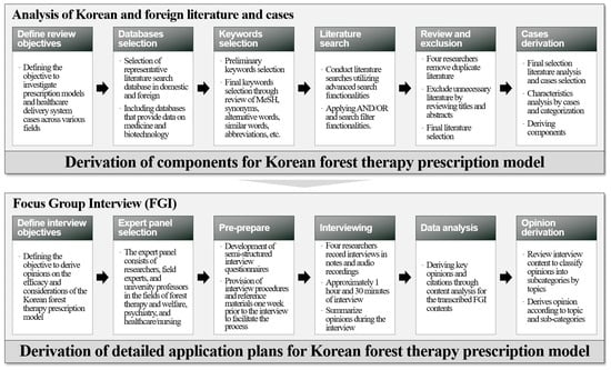 This study was conducted as an exploratory study aimed at deriving components and application plans for the design of a forest therapy prescription model. Considering the lack of specific examples of nature-based prescription models in Korea, including those for forest therapy, the Korean and foreign literature and case studies were used to analyze cases involving prescription models and healthcare service provision systems in different fields, and the basic components required to devise a forest therapy prescription model were derived. In addition, to derive a specific application plan for the forest therapy prescription model, an FGI was conducted with experts to collect and analyze opinions on the stakeholders and detailed procedures (Figure 1). To ensure the ethical validity of the research, the study was conducted with the approval of the Institutional Review Board (IRB) of Chungbuk National University (IRB Approval Number: CBNU-2024-A-0015).