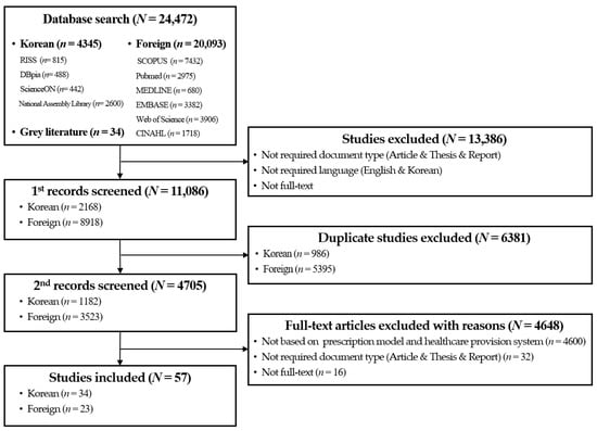 To select the relevant literature, the criteria for the literature selection were established through a meeting of four researchers. The literature selection process aimed to investigate the prescription models and healthcare service provision systems in the fields of forest therapy, medical and health services, exercise prescriptions, and smart healthcare, to analyze the characteristics of each case, and to derive application plans for forest therapy prescription models. The criteria for the literature selection were as follows: (1) articles and theses; (2) written in Korean or English; (3) studies that developed prescription models and healthcare service provision systems in the fields of forest therapy, medical and health services, exercise prescriptions, and smart healthcare; (4) studies that presented guidelines or frameworks for prescription procedures and healthcare service provision; and (5) studies that analyzed the current status of prescription models and healthcare service provision. During the literature selection process, four researchers searched domestic and foreign databases. Initially, duplicates were excluded, and irrelevant publications that did not meet the selection criteria were eliminated through a review of titles and abstracts. Subsequently, the contents of the gray literature, such as references in research reports, were reviewed, and any related publications were included in the final selection. Through this process, 57 papers were ultimately selected (Figure 2).