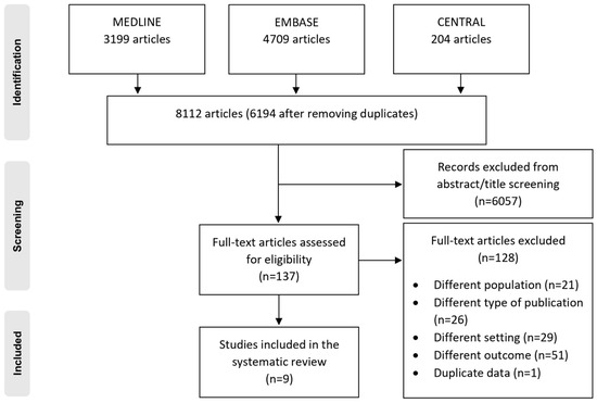 A total of 8112 records were identified through the search in databases. After eliminating duplicate entries, 6194 unique records remained to be screened for titles and abstracts (Figure 1). Following the review of titles and abstracts, 137 articles were identified as being potentially relevant and were retrieved for a thorough evaluation of their full texts. After this evaluation, 128 articles were excluded for various reasons, including differences in patient populations, study types, settings, and reported outcomes, as well as one duplicate publication (illustrated in Figure 1). As a result, nine articles met our eligibility criteria [14,15,16,17,18,19,20,21,22].
