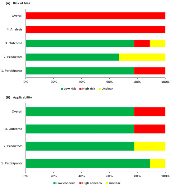 - Moons, K.G.M.; Wolff, R.F.; Riley, R.D.; Whiting, P.F.; Westwood, M.; Collins, G.S.; Reitsma, J.B.; Kleijnen, J.; Mallett, S. PROBAST: A Tool to Assess Risk of Bias and Applicability of Prediction Model Studies: Explanation and Elaboration. Ann. Intern. Med. 2019, 170, W1–W33. [Google Scholar] [CrossRef]