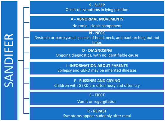 The illness currently known as Sandifer’s syndrome was first described in the 1960s by the Austrian neurologist Marcel Kinsbourn. It takes its name from a British doctor, Paul Sandifer, who was the first to notice a correlation between the occurrence of torticollis in children after a meal [11,12]. According to the definition, it is a non-specific, extraoesophageal manifestation of gastroesophageal reflux disease (GERD), accompanied by neurological symptoms similar to epileptic seizures [12]. In the literature, it is most commonly described as dystonia, the occurrence of involuntary movements located around the head, neck, and torso, as well as shaking, problems with breathing, eye rotation and a decrease in muscle tone [11,13]. In contrast to epileptic seizures, during seizures in Sandifer’s syndrome, there is no rhythmic or clonic component, and the symptoms do not affect the limbs [5,11,12]. In addition, symptomatic episodes do not occur during sleep, and patients are conscious and partially react to stimuli [5]. The next important piece of information that makes it possible to distinguish the syndrome is the time when seizures occur: usually a short time after feeding [14]. In addition to the symptoms ascribed to Sandifer’s syndrome, depending on age, children will have various gastroesophageal reflux disease (GERD) symptoms. In infants, these include crying and irritation, unwillingness to feed, and further consequences involving problems with gaining weight and recurrent respiratory tract infections, including lung infections [15]. In older children, the symptoms are identical to those that occur in adults, that is, burping, heartburn, vomiting, a chronic cough, chronic stridor and wheezing, recurrent lung infections, and apnoea [5,15].
