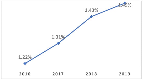 Annual Percentage of patients with history of Bariatric Surgery from all THA Procedures (2016–2019).